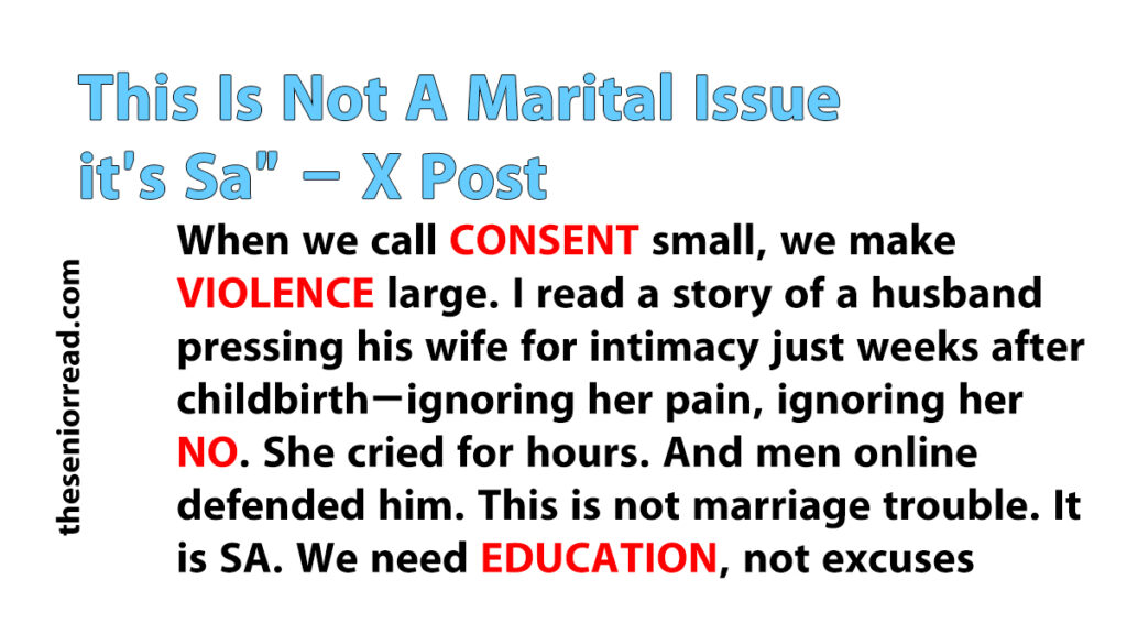 I came across a post on X where a husband was pressing his wife for intimacy only a month after she had given birth. The way it was described, he kept insisting, disregarding her clear signals and her need for recovery.