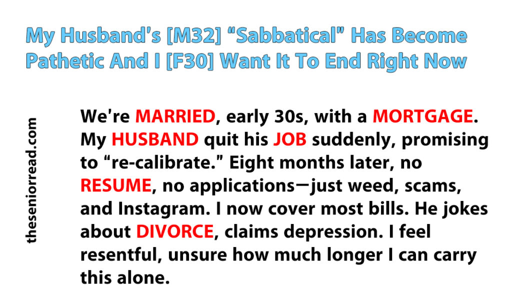 To be fair, he has done some handy work around the house, fixing small things. But most of his days are spent online or disengaged, while I shoulder the majority of our financial responsibilities. We used to split bills evenly, but now it’s closer to 80/20.