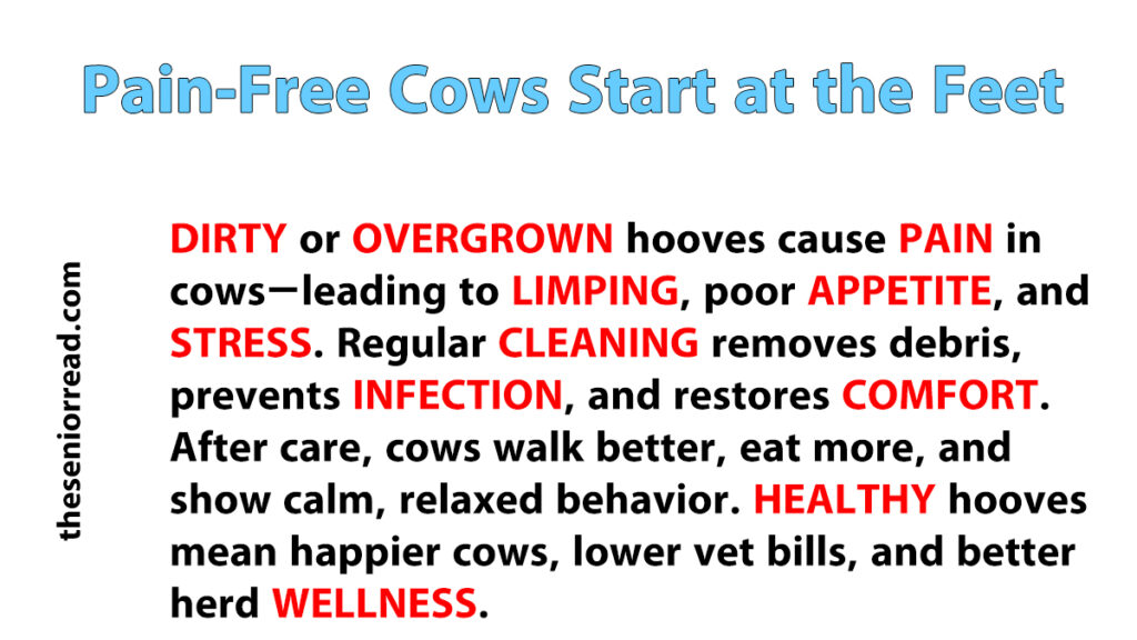When hooves are clean, cows feel better. They walk with ease, stand tall, and move freely. Pain is gone, and their body language shows it—calm eyes, steady steps, and relaxed posture. Clean hooves help cows graze, rest, and socialize. You’ll see better appetite, more milk, and a brighter mood. Farmers often say their cows seem “lighter” after hoof care.