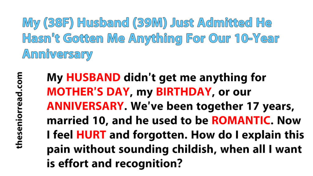 We’ve been together for 17 years, married for 10. He used to be so romantic, thoughtful, and creative with his gifts. He made me feel loved, important, and cherished. Back then, it was clear he put time, effort, and thought into what he gave me. Now… I get nothing.