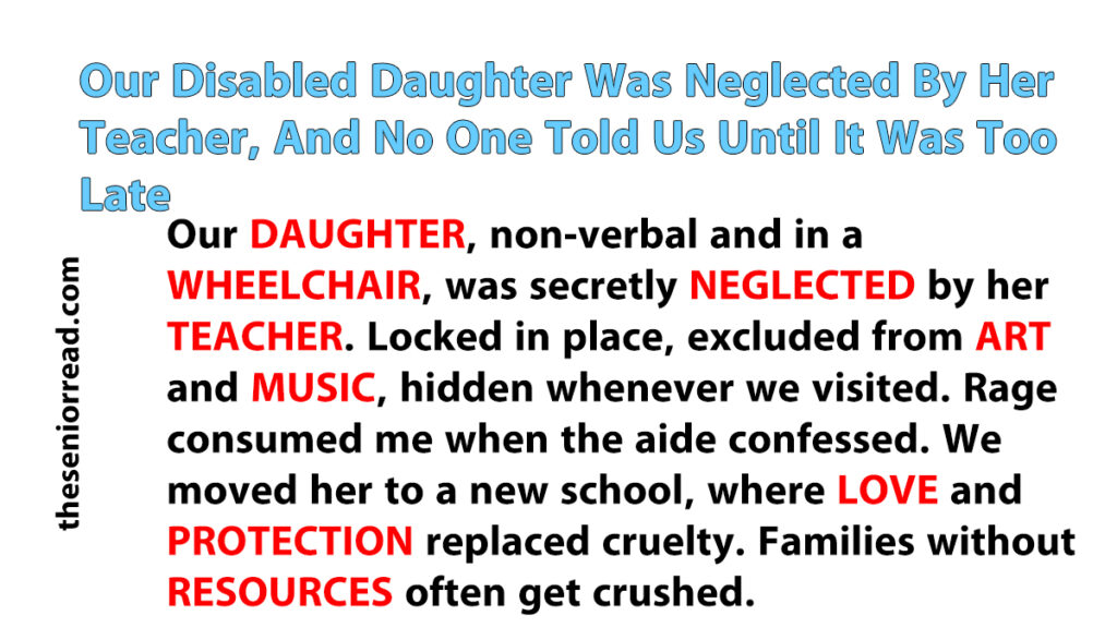 Our daughter had been left in the corner of the classroom all day, her wheelchair brakes locked so she couldn’t move. She wasn’t allowed to join the other children for art, music, or group work. During recess, she was sometimes pushed outside, but even then, she was left alone by the wall.