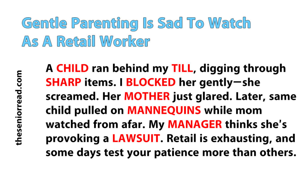 I had sharp pins and security tags back there, and other customers waiting. When the child tried to hide behind me, I gently blocked her with my arm. She screamed like I’d hurt her.