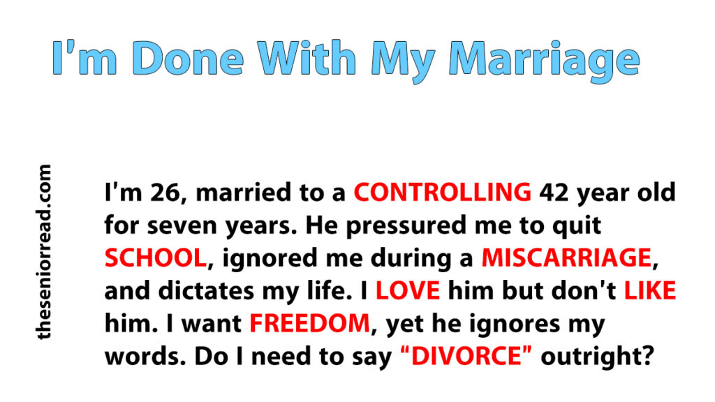 I am 26, married to my 42‑year‑old husband for nearly seven years. At this point, I feel suffocated. I don’t find him attractive anymore, and I don’t particularly like him as a person. We married after only a few months of dating. Coming from a strict religious family, I thought marrying him was the right thing to do, and I believed I could change him into a great husband.