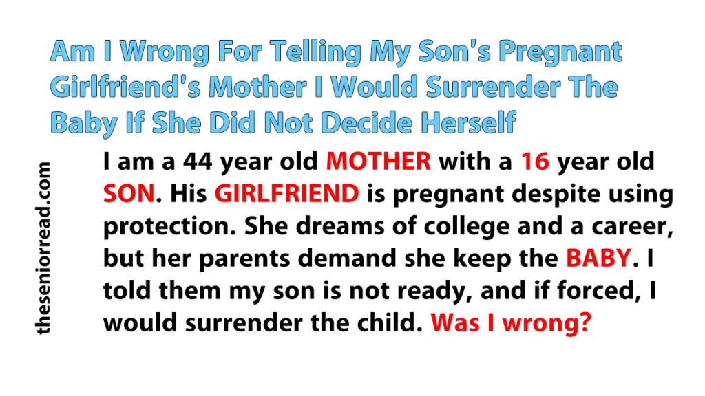Later that evening, around 8 PM, her mother called me. I don’t know how she got my number, but she was furious, accusing me of encouraging her daughter to destroy their grandchild and calling me a murderer. I explained that her daughter has a bright future, and I don’t want to see it lost because she is 16 and involved with my son. I even said that if they break up someday, custody and child support would be a nightmare.